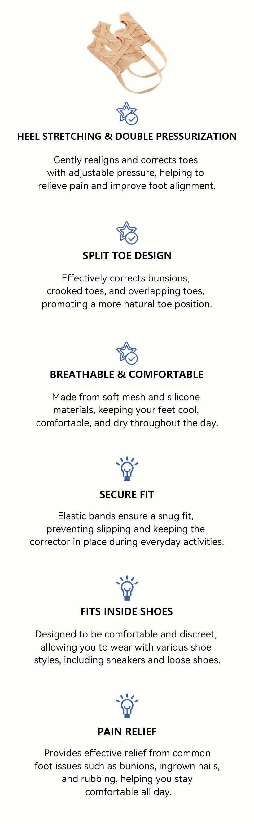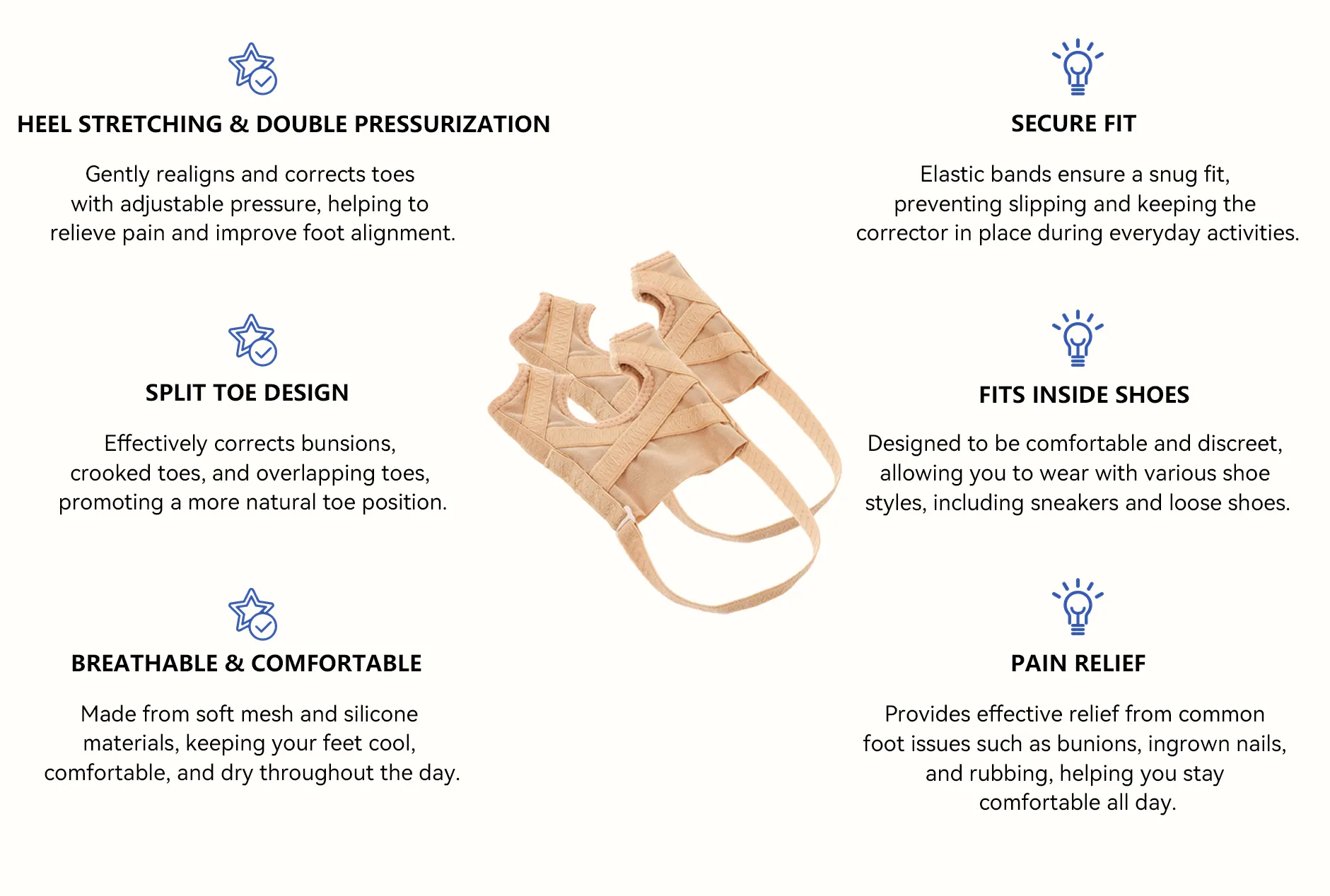 - Heel Stretching & Double Pressurization – Gently aligns and corrects toes with adjustable pressure.